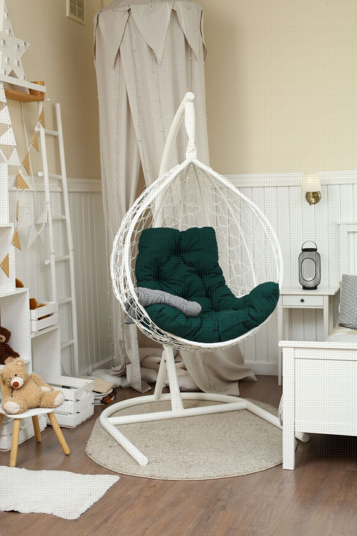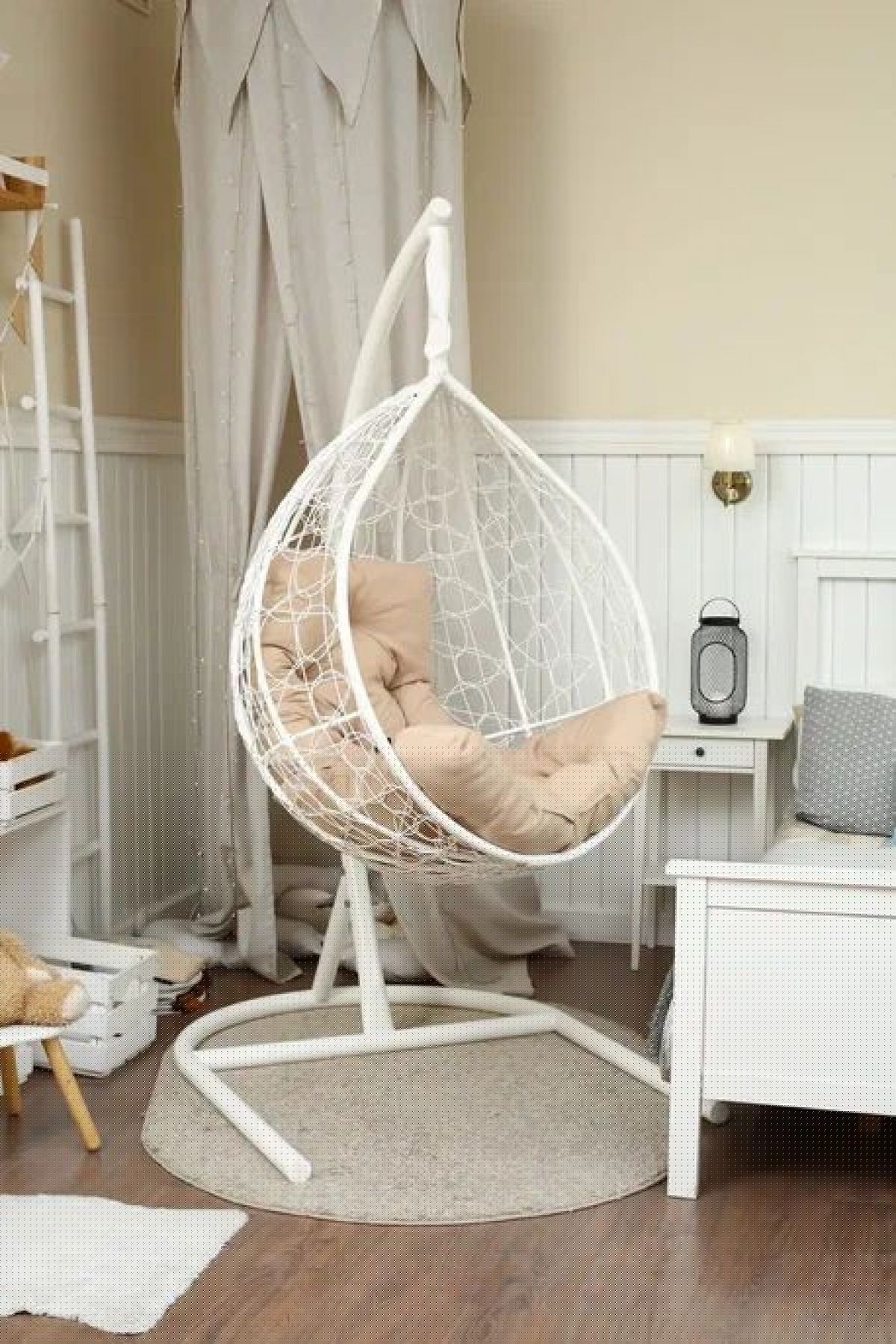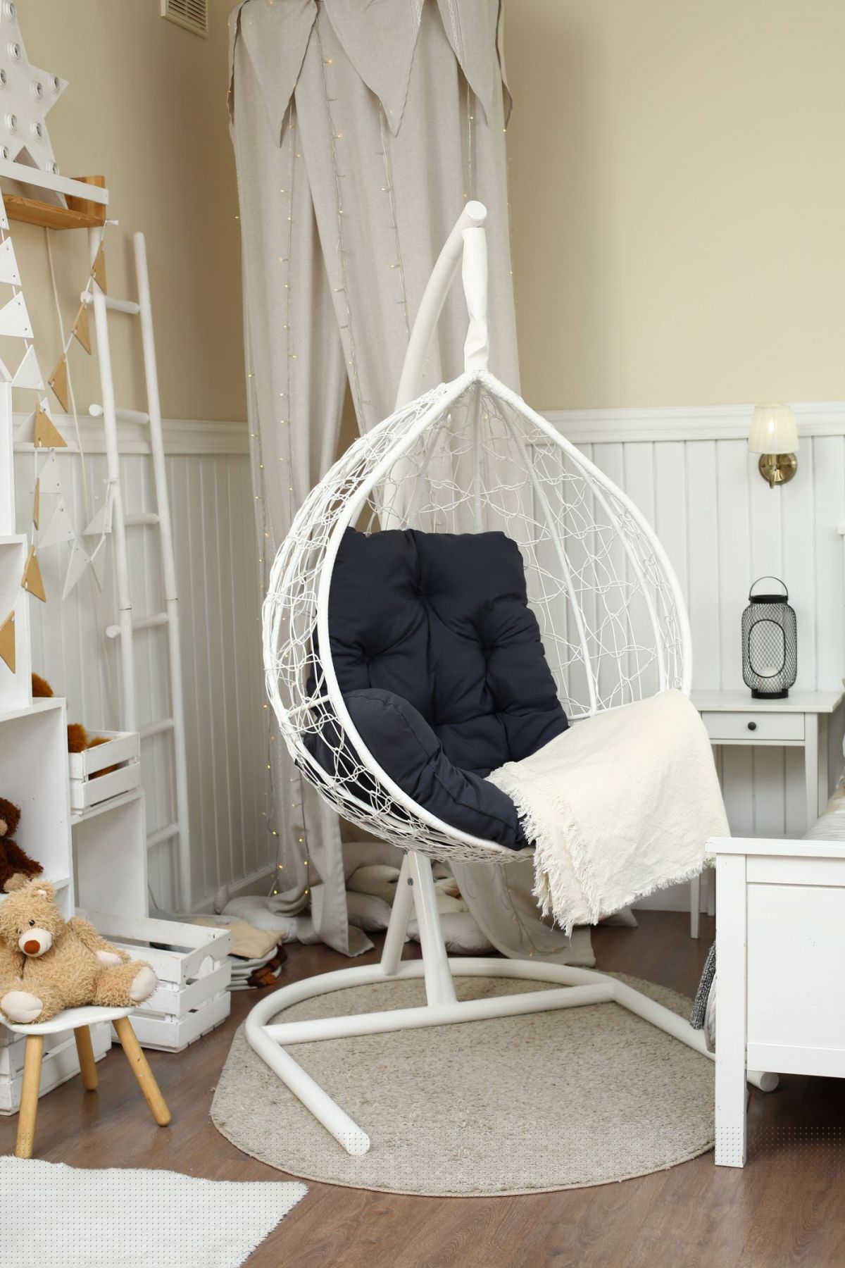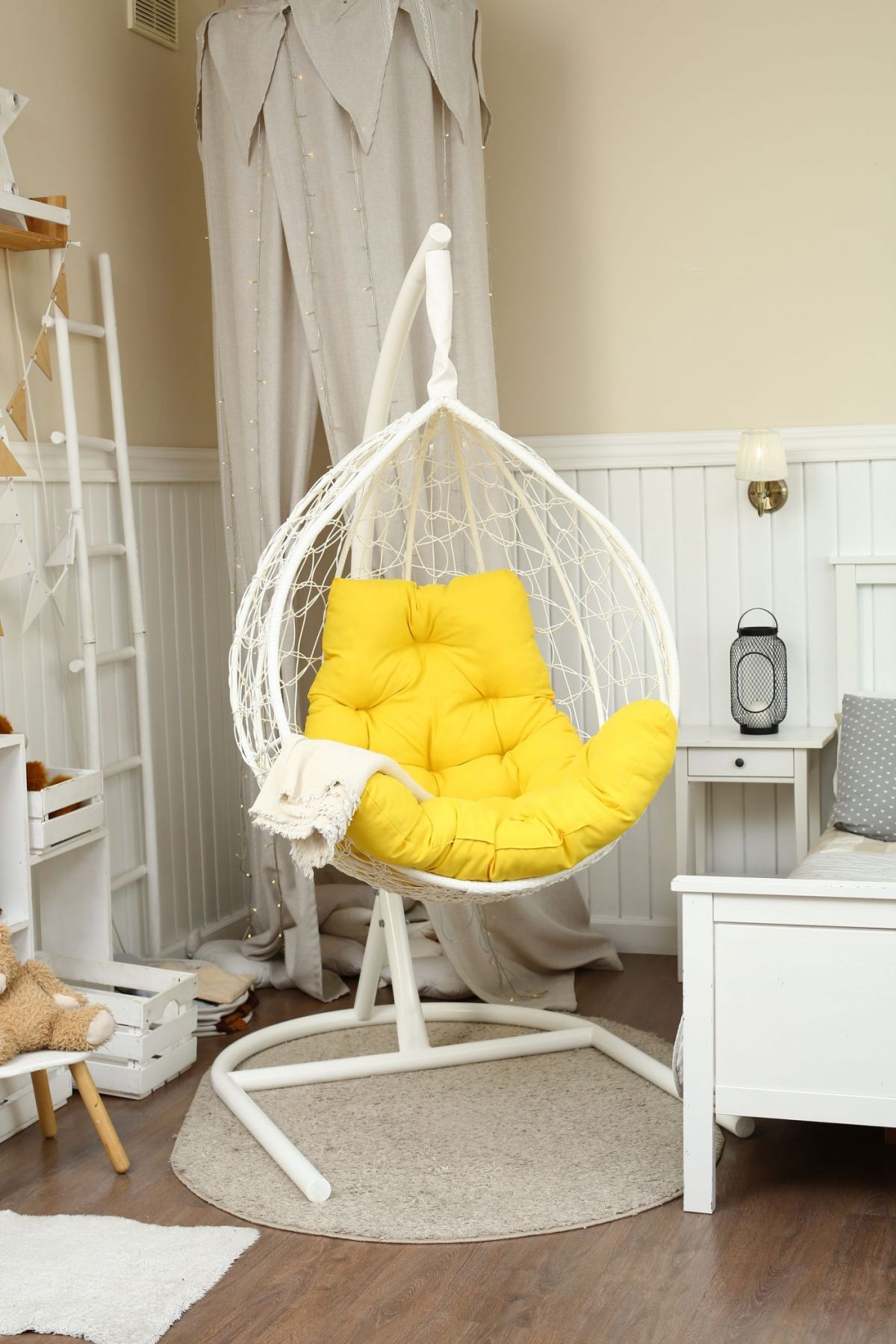 Стойка - стальная диаметр 51 мм, толщина 3 мм. Покрытие порошковой краской. Кокон - стальной каркас с оплетенным экоротангом. Подушка из Габардиновой ткани.